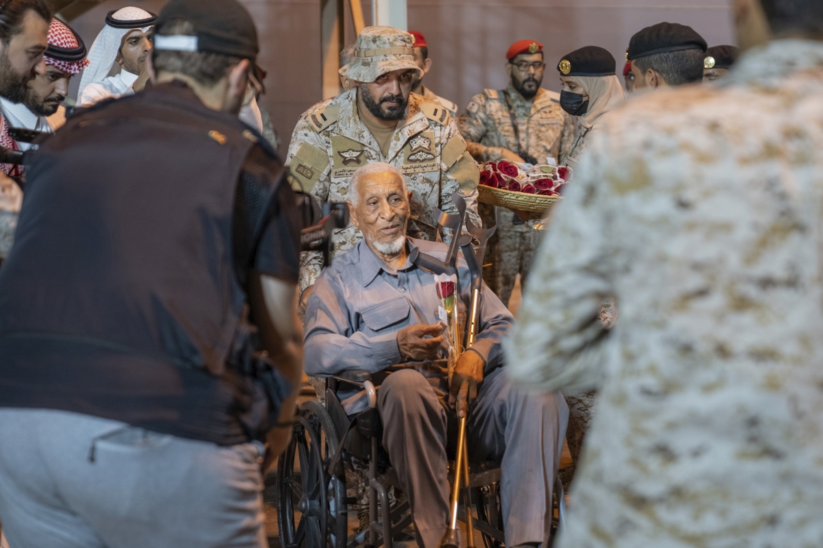 صورة للرعايا السعوديين والأجانب القادمين من السودان إلى جدة عبر رحلة إجلاء سعودية عند وصولهم إلى قاعدة الملك فيصل البحرية في جدة.