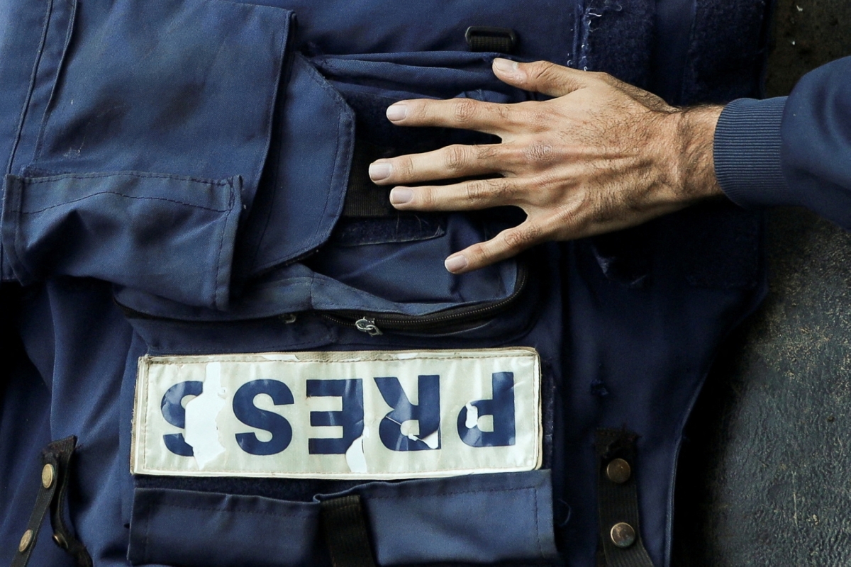 رجل يلمس السترة الواقية من الرصاص للصحافي عمر الديراوي بينما يتجمع المشيعون حول جثث الفلسطينيين الذين قتلوا في الغارات الإسرائيلية، في مستشفى شهداء الأقصى في دير البلح وسط قطاع غزة، في 3 يناير
