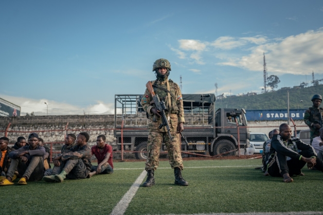 جندي من حركة إم23 يراقب مجموعة من نحو مائة مقاتل من حركة تعرف باسم القوات الديمقراطية لتحرير رواندا