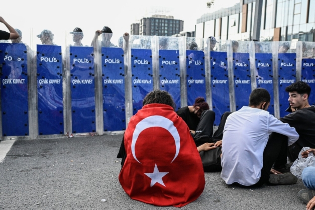 متظاهر ملتحف بالعلم التركي يجلس أمام عناصر شرطة مكافحة الشغب التركية الذين يغلقون مدخل مقر حزب الشعب الجمهوري (CHP)، خلال مظاهرة في إسطنبول، في 8 سبتمبر 2025