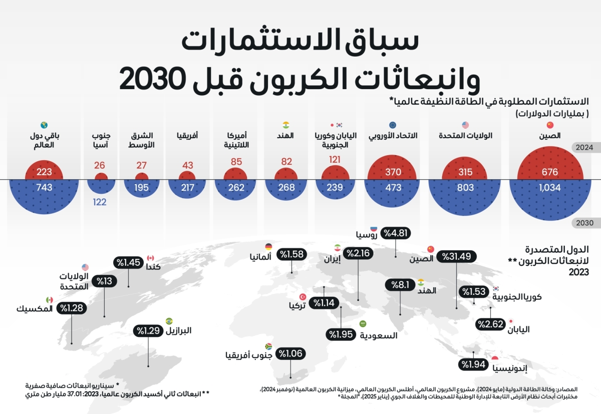 تمثل الصين والولايات المتحدة معا، أكثر من نصف الاستثمارات العالمية في التحول نحو الطاقة المتجددة، في حين تنتج أكبر أربع دول ملوثة نحو 60 في المئة من إجمالي الانبعاثات، مما يبرز مدى تركيز المسؤولية المناخية.