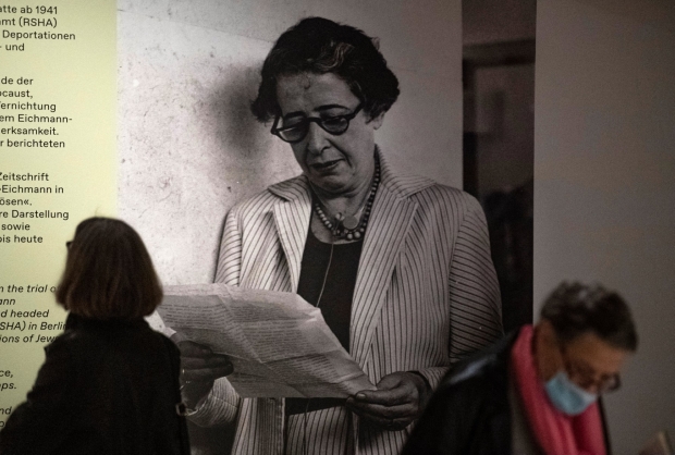 زائر يقف بجانب صورة حنّة أرندت خلال معرض "حنّة أرندت والقرن العشرون" في المتحف التاريخي الألماني ببرلين، 6 مايو 2020