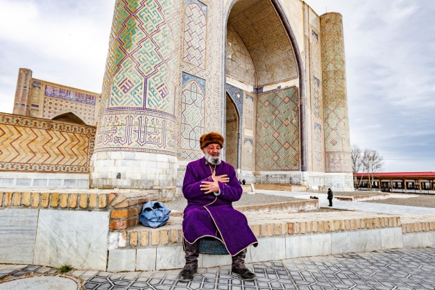 متسوّل أمام مسجد بيبي خانم في سمرقند، أوزبكستان