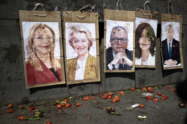 لافتات (من اليسار) رئيسة الوزراء الإيطالية، ورئيسة المفوضية الأوروبية، ووزير التعليم والاستحقاق الإيطالي، ووزيرة الجامعات والبحث العلمي الإيطالية، ورئيس الوزراء الإسرائيلي بنيامين نتنياهو خلال تظاهرة ضد إعادة تسليح أوروبا وسياسات التعليم الحكومية، تورينو، أبريل 2025