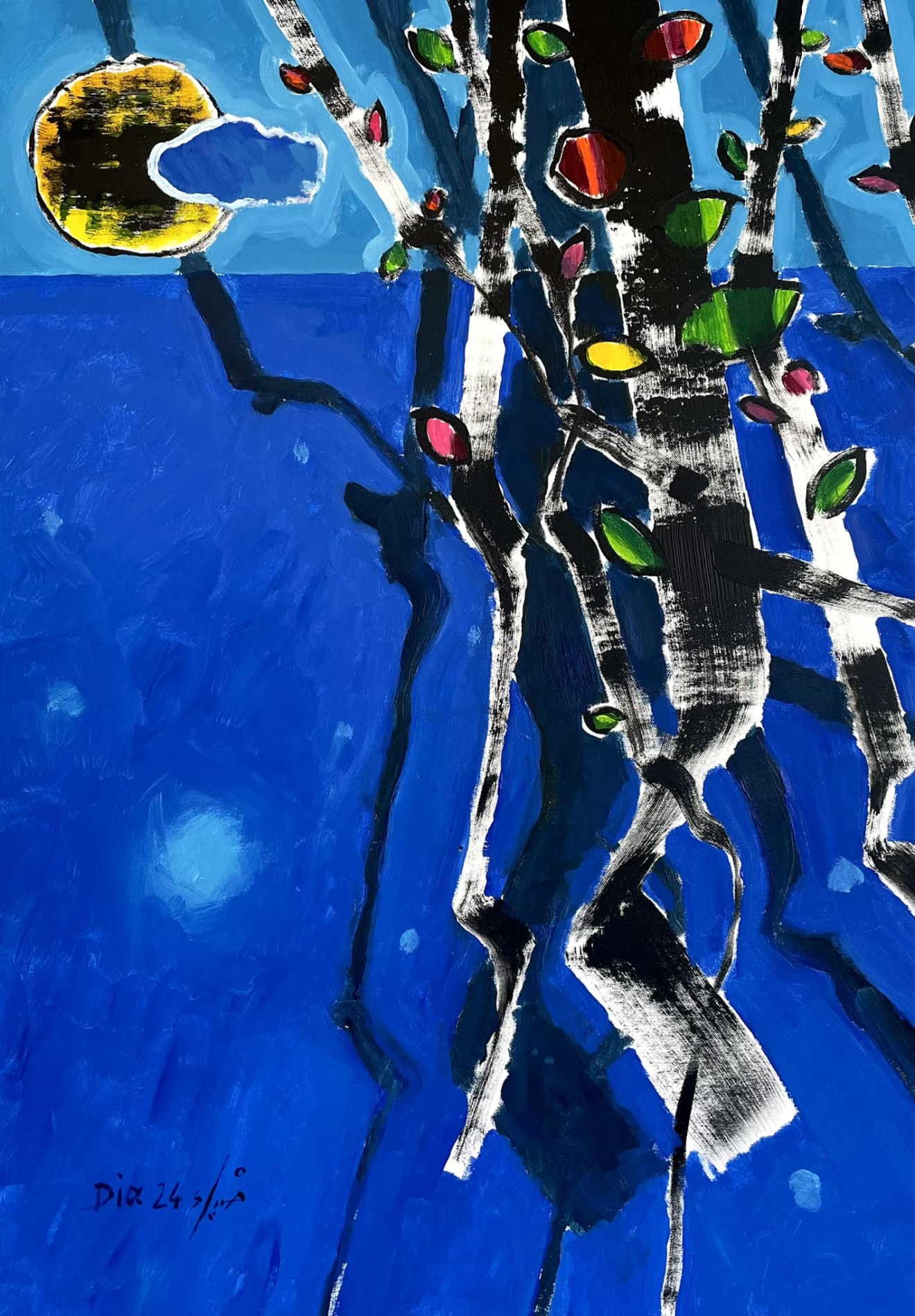 من الواضح أن الفنان جنح في هذه اللوحات، كما في أعماله السابقة، إلى أجواء صوفية تحمل بصمته الخاصة، إذ لم يكن الضوء خافتا ولا دراميا أو غيبيا، بل هو ناصع ورقراق. أما الألوان فلم تكن ترابية غامضة، بل عامرة بظلال شفافة رسمها الفنان في أعمال عديدة، مائية الروح، تميل إلى الأزرق والأخضر والبنفسجي، مما يحيلنا إلى مشاهد أزهار الخزامى وعطورها. وحول هذه الطمأنينة الهادئة المضيئة بألوانها، قال الفنان لـ"المجلة": "نشأت في بيئة صوفية. كان أبي صوفيا يأخذني إلى حلقات الذكر، وعلى الأرجح تأثرت بهذه الأجواء. فاللوحة بالنسبة إلي ليست مشهدا بصريا فقط، بل تظهير لحالة روحية ونفسية. والأمر ينطبق على لوحاتي التجريدية والتشكيلية على السواء. فالصمت بارز والسكون حاضر من ناحية بناء العمل ومن ناحية اختيار طريقة المعالجة الفنية".