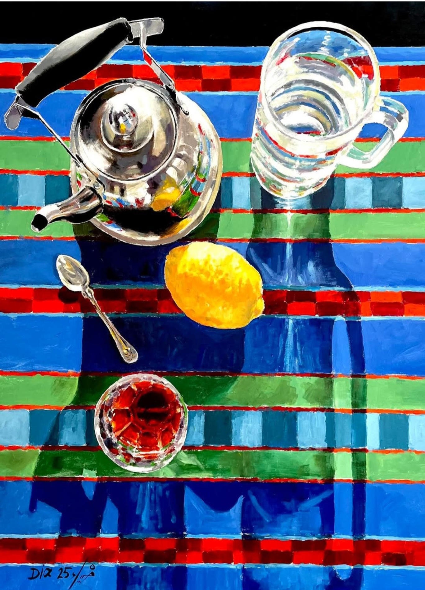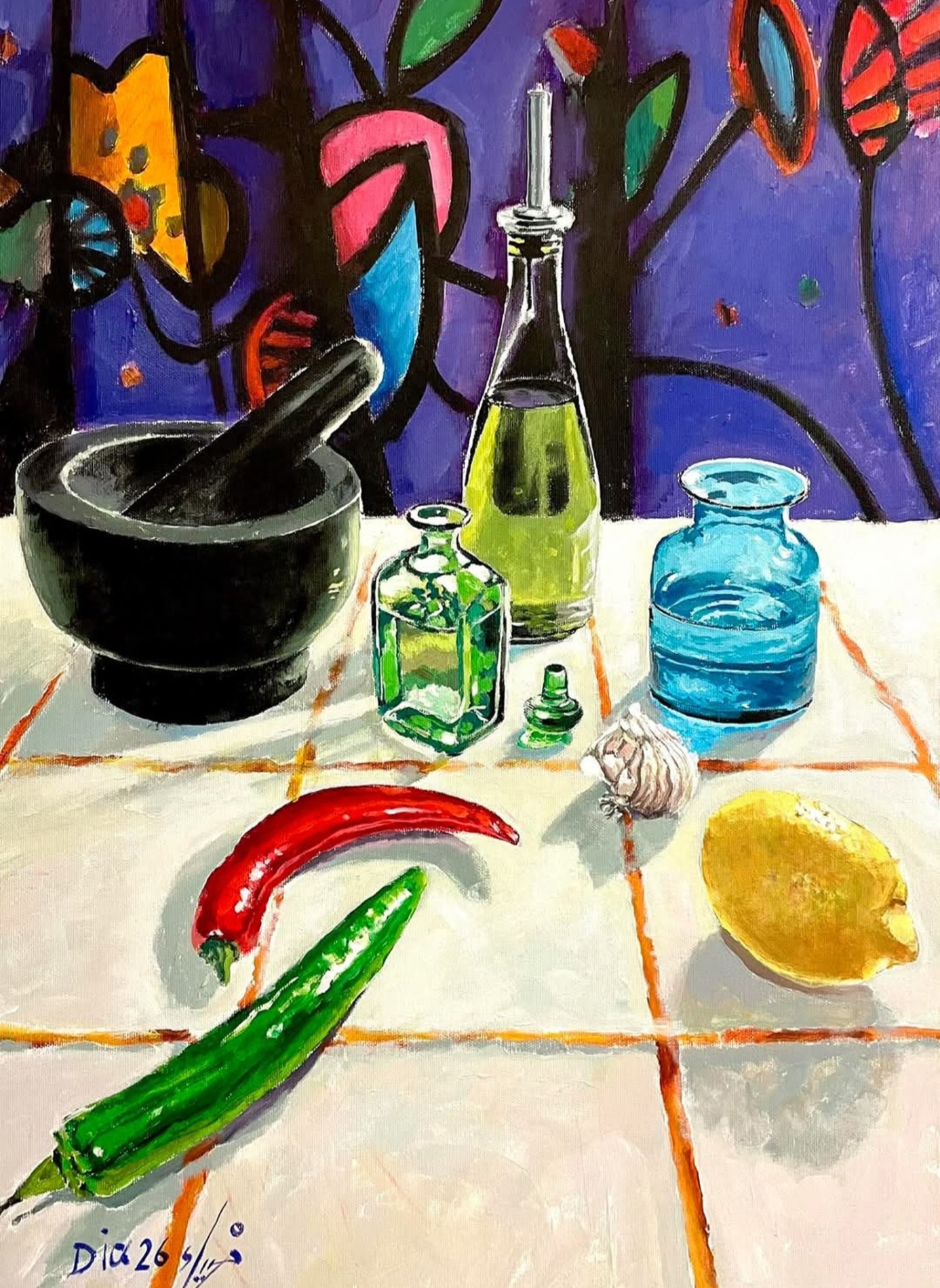 لا يضع الفنان ضياء الحموي "أل" التعريف لمفردة "نسيان"، فما يشكله في لوحاته هو مقتطفات من حياته اليومية العادية، من دون أن يشير إليها بوصفها نابعة من ذاكرة يغشاها الحزن، بل باعتبارها نتفا مضيئة بعبورها، ومفعمة بفرح ملون. ولا شك أن كلمة "نسيان" تأتي هنا بصيغة أخف من "النسيان"، أقل درامية، وتحمل إشارة إلى حلاوة العيش على هذه الأرض، حلاوة متاحة للجميع، ولا تتطلب من الفرد سوى الالتفات إليها وتثمين أهميتها في سياق حياته اليومية.