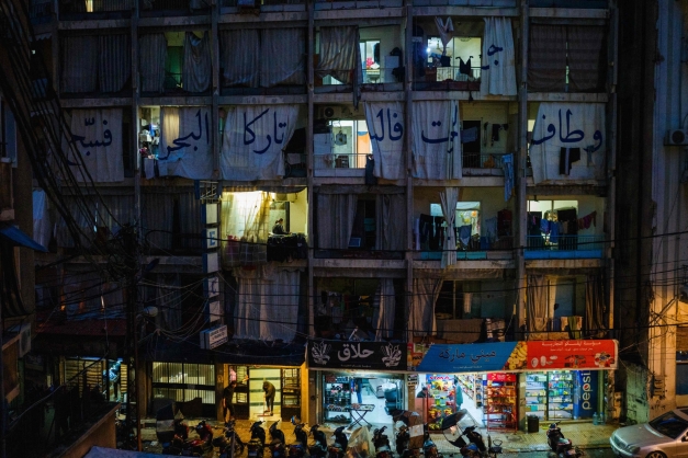 مبنى سكني في وسط بيروت، يكتظ بالنازحين بعد تجديد الجيش الإسرائيلي دعوته لسكان الضاحية الجنوبية لبيروت بالإخلاء، في 22 مارس 2026