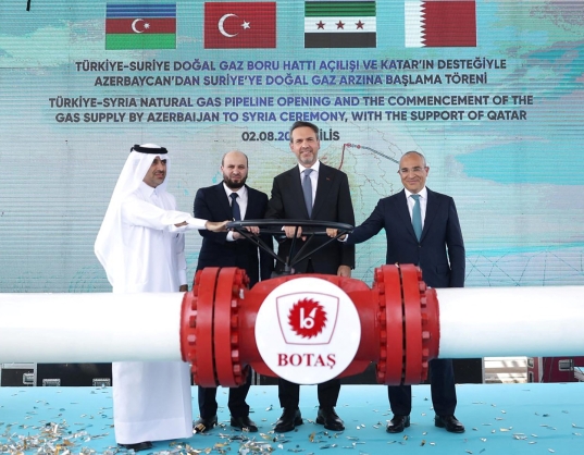وزير الطاقة التركي ألب أرسلان بيرقدار، ووزير الاقتصاد في جمهورية أذربيجان ميكائيل جباروف، ووزير الطاقة السوري محمد البشير، ومدير عام صندوق قطر للتنمية فهد بن حمد حسن السليط، خلال افتتاح خط أنابيب الغاز الطبيعي بين تركيا وسوريا