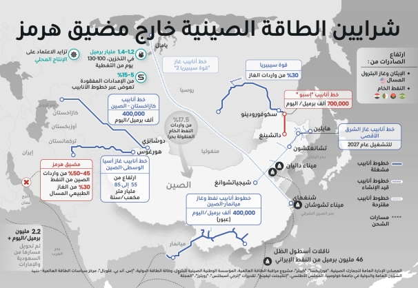 كما تشهد الواردات من روسيا، والتي تغطي نحو 17-18 في المئة من واردات النفط الخام الصينية ونحو 30 في المئة من وادرات الغاز، ارتفاعا ملحوظا عبر الشحنات البحرية وخط أنابيب النفط بين شرق سيبيريا والمحيط الهادئ، إلى جانب تدفقات متزايدة من كازاخستان ومنتجين آخرين. مع ذلك، لا يزال تأثير خطوط الأنابيب البرية محدودا، إذ لا تغطي سوى 5-15 في المئة من الإمدادات المتأثرة.