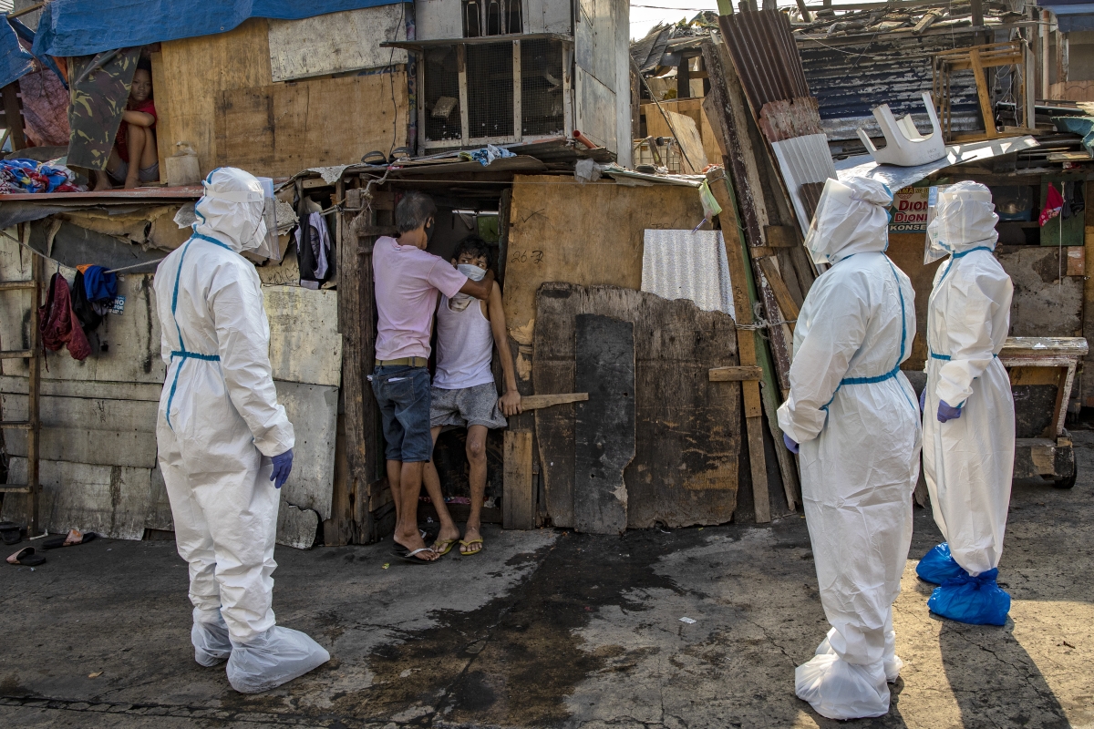 ضباط شرطة يرتدون بدلات واقية في محاولة مع أحد السكان المشتبه في إصابته بـ COVID-19 من منطقة عشوائية لنقله إلى منشأة عزل في مانيلا ، الفلبين. (جيتي)