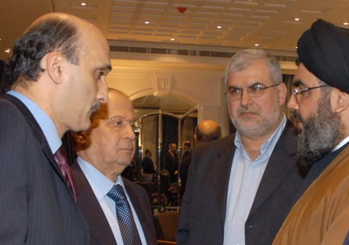 [caption id="attachment_55250179" align="aligncenter" width="620"] رئيس حزب القوات اللبنانية، سمير جعجع وميشال عون رئيس كتلة التيار الوطني الحر ومحمد رعد رئيس كتلة الوفاء للمقاومة في حديث مع الامين…