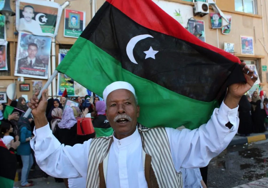 [caption id="attachment_55242548" align="aligncenter" width="620"] ليبي يحتفل بانتصار الشعب على نظام العقيد القذافي[/caption]