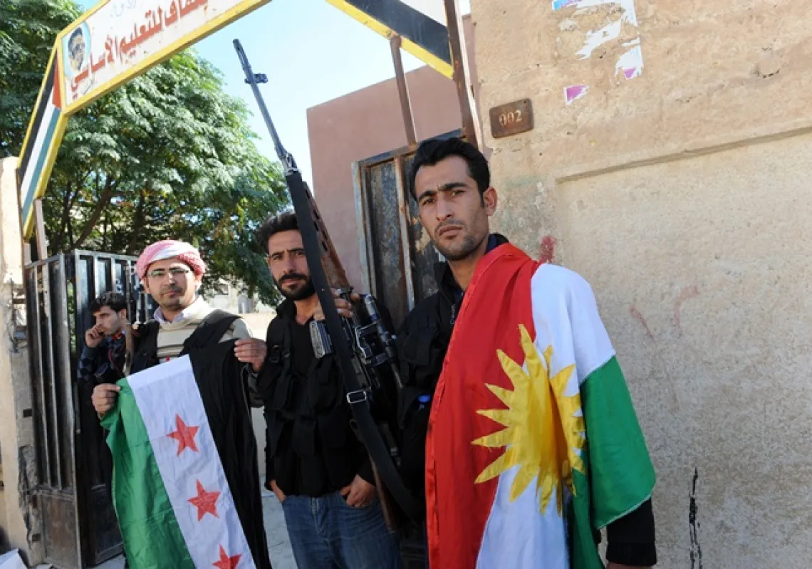 [caption id="attachment_55241797" align="aligncenter" width="620"] مقاتلون سوريون في بلدة كردية قرب الحدود مع تركيا يحملون علما كرديا[/caption]