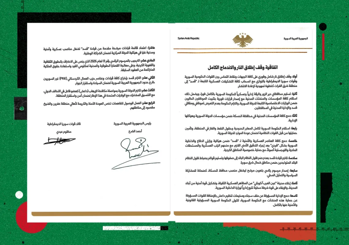 تنشر "المجلة" النص الكامل لاتفاقية وقف إطلاق النار والاندماج الكامل بين الحكومة السورية وقوات سوريا الديمقراطية (قسد)، في المحافظات الشرقية والشمالية الشرقية الثلاث، الذي وقّعه الرئيس أحمد الشرع